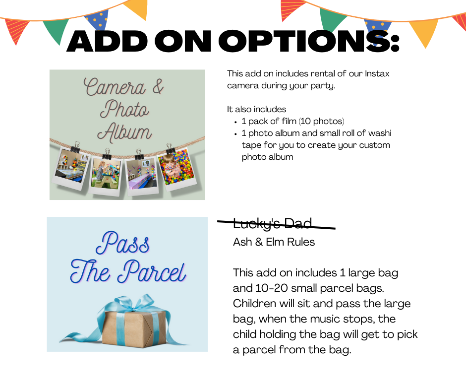 - We do not offer refunds on parties cancelled less than 30 days prior to the party.